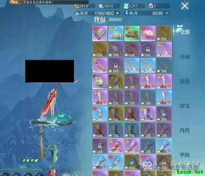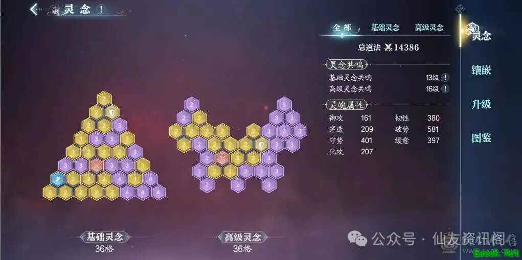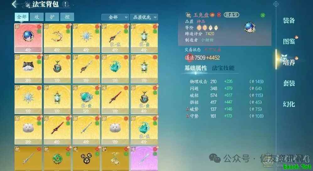 资源与养成:有196万银子、1只黄鸟,还有神品法宝、阵灵收集、灵念镶嵌等养成内容,各项属性(如破势、御攻)已成型。