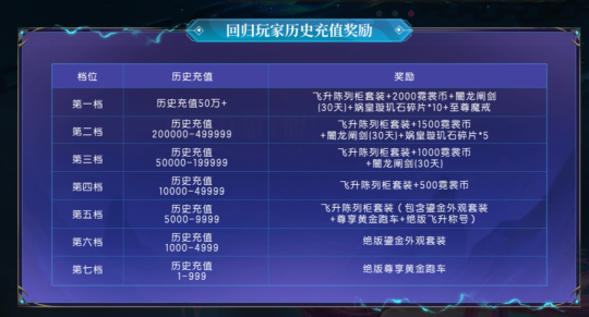 本次新服特别为回归玩家定制专属权益,账号满足“≥30天未登录”条件即可认定为“回归玩家”,可领取回流专属奖励(活跃玩家无法领取)。回归玩家历史充值奖励共设7个档位,根据玩家历史充值金额分级发放,充值额度越高福利越丰厚,涵盖飞升陈列柜套装、霓裳币、娲皇璇玑石碎片、绝版鎏金外观套装、绝版尊享黄金跑车等珍稀道具,帮助回归玩家快速衔接战力,重拾巅峰游戏体验。