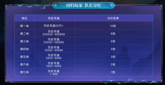 为增强社交互动性,活动还推出了“组队回归致富”机制,组队时间为11月14日至11月21日。活跃玩家与回归玩家均可创建5 人小队,可邀请最多4名回归玩家加入(回归玩家可加入其他玩家队伍,加入后无法退出),小队满员后所有成员可领取1000万象币(仅限万象1服领取)。开服后玩家绑定新服角色即可激活分红权益,所有回归账号每消耗100金币可获得10积分;队长可分红所有回归队员所产生的积分,即队员每获得10积分,队长可额外获得1积分×积分倍率,分红按“成员获得积分×10%×成员档位倍率”。队员积分越多,队长享受分红越丰厚,实现“他人消费、队长获利”的被动收益模式。