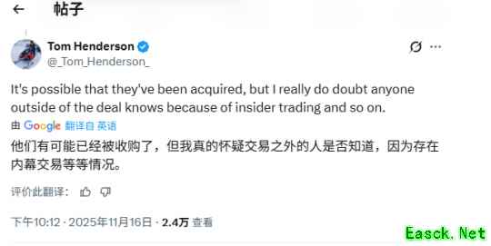 而就在不久前,推主MBG也发文表示:“有内部人士暗示育碧已经被某方收购了”。同时知名爆料人Tom Henderson在评论区回应:“可能他们已经被收购了,但我真的怀疑在交易之外有人知道这件事,因为涉及到内部交易之类的原因。”
