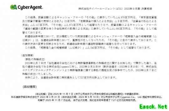 《赛马娘》开发商Cygames的母公司CyberAgent近日宣布,因与科乐美达成诉讼和解,将在本财年计入7.27亿日元(约合470万美元)的特别损失。该信息源自该公司11月14日发布的年度财务简报。