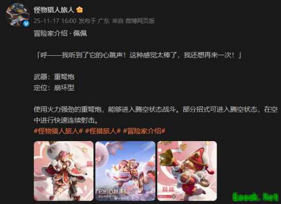 今日,游戏官博发文简要介绍了冒险家“佩佩”,据介绍,该角色使用的武器为重弩炮,定位为崩坏型。