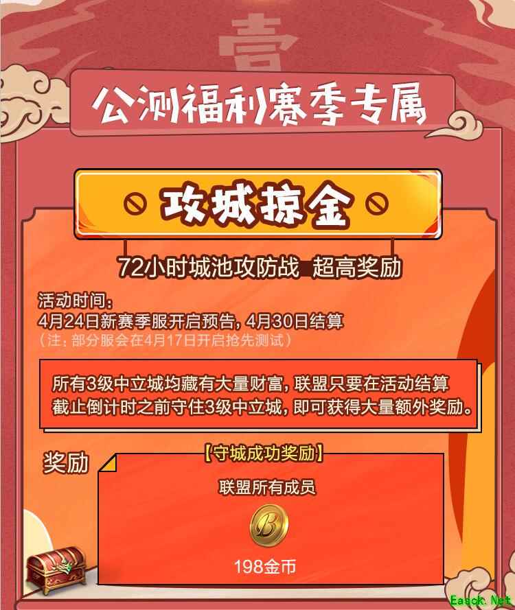 在福利赛季中,服务器初始开放4个出生洲和2个资源洲;剩余3出生洲和1个资源洲将逐步开放。所有3级中立城均藏有大量财富,活动期间,同盟只要在活动结算截止倒计时之前守住3级中立城,即可获得大量额外奖励——同盟所有成员将获得198金币活动福利。