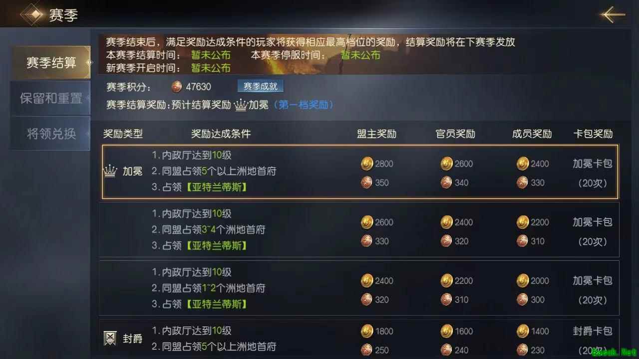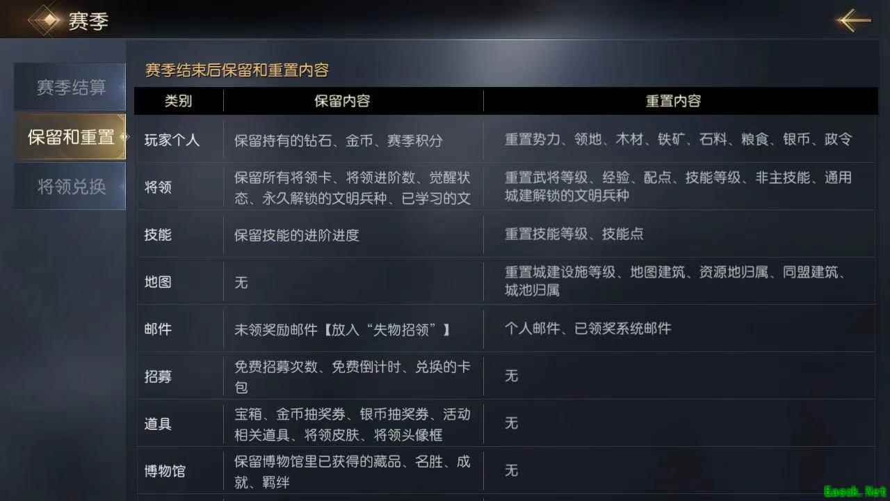 此外,赛季中将领、技能、金币、钻石等道具会保留,已经解锁的文明兵种、进阶状态、觉醒状态同样保留,而建筑等级、技能点、同盟数据会重置。玩家们在期待新赛季的同时,不要忘了为当前赛季的结算做好准备工作。