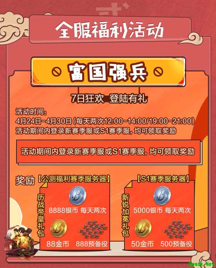 活动期间,所有新赛季服或S1赛季服的君主上线均可领取奖励。其中,在福利赛季服务器的君主,活动期间按时上线将能获得8888银币?、88金币、888预备役等福利。
