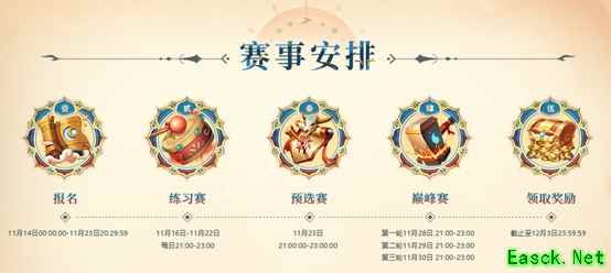 第一轮:11月28日 21:00-23:00第二轮:11月29日 21:00-23:00第三轮(决赛):11月30日 21:00-23:00重要提示:为鼓励大家踊跃参与练习赛,尽快熟悉战场设定,总结对战技巧,我们将对练习赛中表现优秀的道友给与一定奖励。玩家可以在11月16日 至 11月22日每日21:00-23:00期间参与练习赛。我们将挑选当日所有场次的第一名的队伍,按队伍整体积分进行排名,排名前十的队伍可获得光宇币奖励。