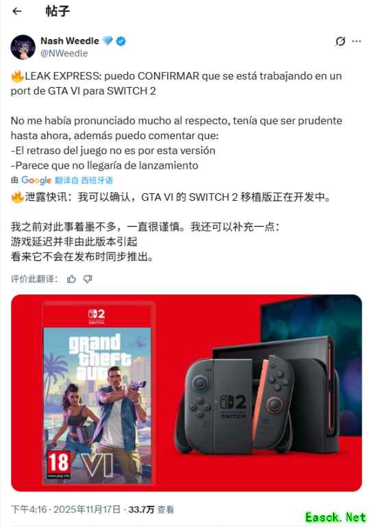 与此同时,任天堂相关爆料人士、以硬件消息闻名的Nash Weedle透露,Nintendo Switch 2版《GTA6》确实在开发中。他指出: