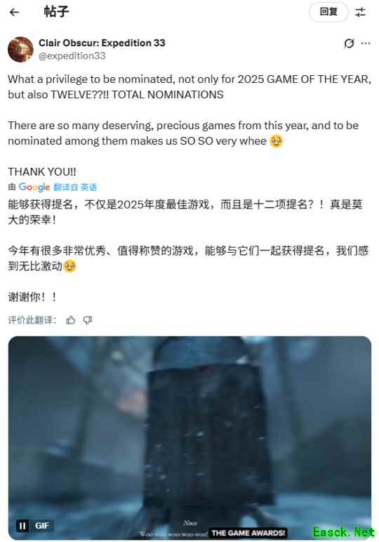 在TGA提名发布后,《光与影:33号远征队》官方在社交媒体X上发文致谢。