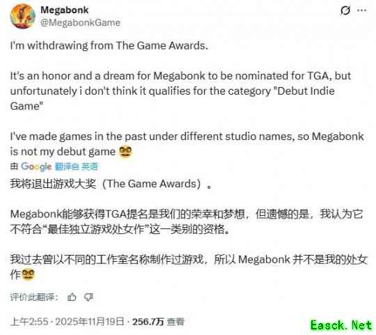 “《Megabonk》获得TGA提名是莫大的荣誉,也是梦想成真,但很遗憾,我认为它不符合‘最佳独立处女作’的评选标准。我曾以不同工作室名义开发过游戏,因此《Megabonk》并非我的处女作,”他写道,“我衷心感谢提名、支持与投票,但占据这个奖项名额并不妥当。”