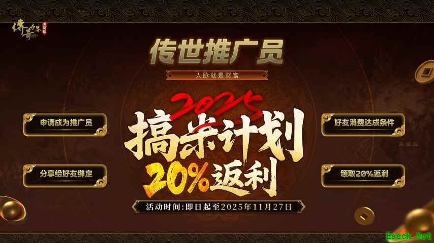 伴随公测临近,《传奇世界重制版》推广员活动"2025搞钱计划"现已火热开放申请。玩家成为推广员后,分享专属链接邀请好友绑定,好友达成消费条件即可享受高达20%的现金返利,实现游戏与收益的双赢。