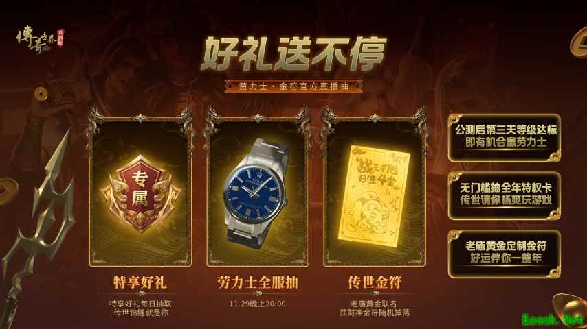 双庙联动中另一大亮点就是老庙黄金的跨界联动。《传奇世界重制版》联手百年老字号重磅定制"传世金符",经由关帝祖庙大师亲自开光后更显价值,11月27日公测后,玩家野外打怪即有机会随机爆出999足金开光"传世好运金符"。此外,在官方直播间不定期会通过福袋送出"武财神金符";专题页活动也开放了抽取通道,让每一位玩家都有机会将这份开服好运收入囊中。