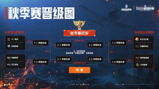 八支从预选赛晋级的精锐舰队,将通过抽签随机分入A、B两个半区,共同角逐年度总决赛的珍贵入场券及秋季赛冠军荣誉。赛事分为两个阶段:
