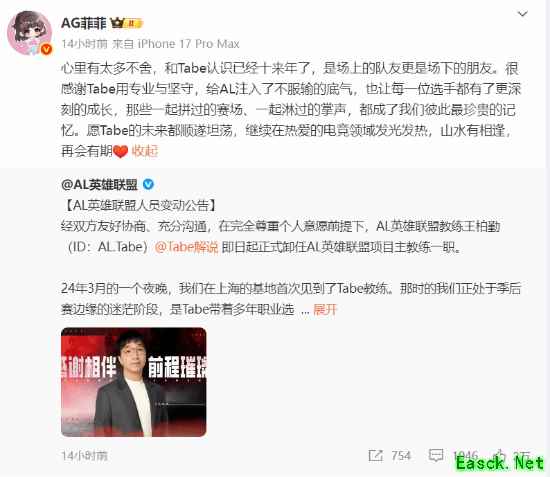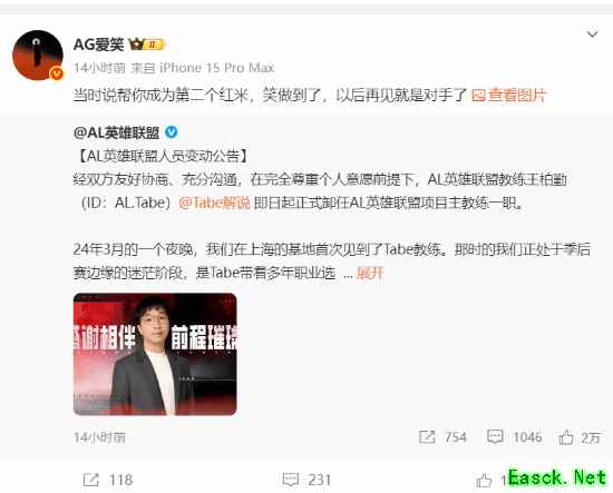 此外,AG电子竞技俱乐部英雄联盟及无畏契约总经理 @AG爱笑(AL战队为AG俱乐部的《英雄联盟》分部)发文回应,“当时说帮你成为第二个红米,笑做到了,以后再见就是对手了。”而AG电子竞技俱乐部CEO @AG菲菲 也表示好聚好散,“愿Tabe的未来都顺遂坦荡,继续在热爱的电竞领域发光发热,山水有相逢,再会有期。”