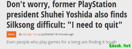 他给出的第一个例子就是《丝之歌》。吉田称赞这款游戏让他不断回去挑战——即便他每次都想放弃。他说到:“我现在正在玩《空洞骑士:丝之歌》。太难了,我一直想着‘我得放弃,这太花时间了’,结果第二天又不由自主地打开继续玩。”