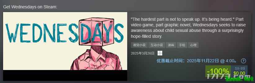目前,《Wednesdays》已在Steam平台开放免费领取,活动时间有限,感兴趣的玩家可前往商店页面领取并永久入库。