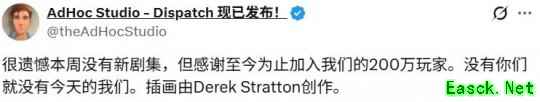 官方表示:“虽然我们也因本周没有新剧集感到遗憾,但更要感谢已加入我们的200万玩家——没有你们就没有我们。"