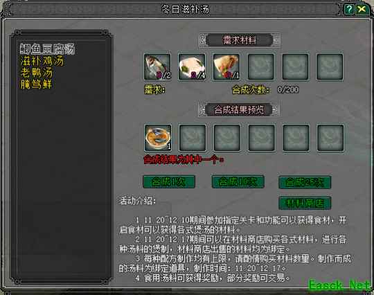 大侠通过参与副本、运镖等玩法收集食材,合成鲫鱼豆腐汤、滋补鸡汤、老鸭汤、腌笃鲜四类汤品。饮汤可得经验、授业点数、装备碎片、兵魄洗炼石等极品道具!
