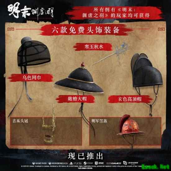 为感谢每一位支持《明末:渊虚之羽》的玩家,无论您购买的是哪个版本,更新游戏后均可免费领取4款专属头饰。至此,玩家更新1.7版本后,共计可领取6款免费头饰装备(涵盖1.6 版本更新2款)。