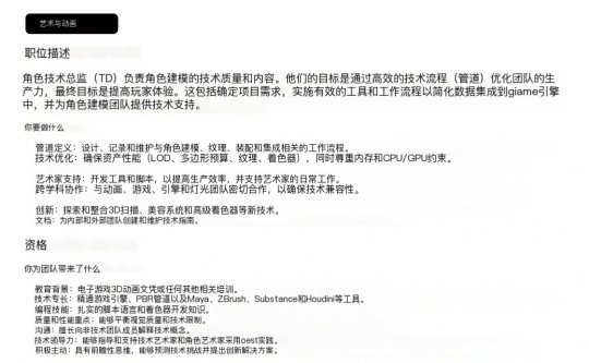 根据职位描述,动画总监将负责角色、场景与物体的动画开发,制定游戏整体动画视觉方案并领导动画团队。另一位专家则将专注于角色建模、技术优化以及与美术团队的协调工作。招聘信息并未透露剧情或技术细节。