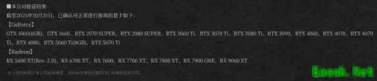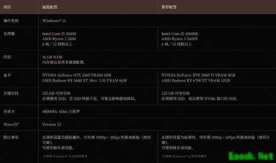 最低配置需RTX 1060(6G)显卡,可以1080P/30帧低画质游玩。推荐RTX 3060 Ti(8G)以上显卡,可以1080P/60帧中等画质游玩。存储空间则需125G,本作容量还是挺大的。