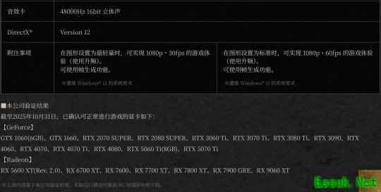 截至2025年10月31日,已确认可正常进行游戏的显卡如下:
