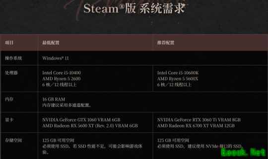 存储空间: 需要125GB可用空间,必须使用 SSD。若SSD性能不足,可能会影响游戏体验