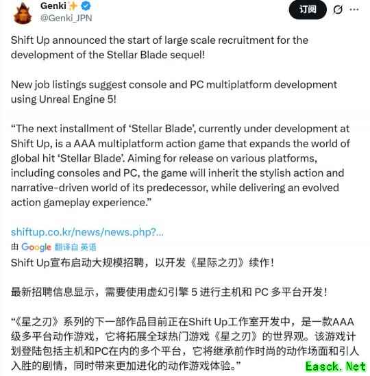 据推主Genki,韩国开发商Shift Up官网发布的一则新招聘信息确认,《剑星2》采用虚幻5引擎制作,将是一款多平台游戏,计划登陆多种主机平台和PC。这与初代游戏《剑星》截然不同,因为该游戏首发仅登陆了PS5平台,后来登陆了PC。
