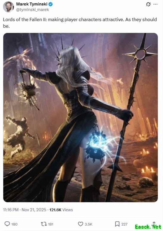 以黑暗奇幻动作游戏闻名的 CI Games 工作室在《堕落之王 2》的开发之前采取了一项重大举措。公司创始人兼首席执行官马雷克·蒂明斯基在社交网络X上发布了一张游戏中女性角色的预告图,重点介绍了角色设计的新方法,并写道: