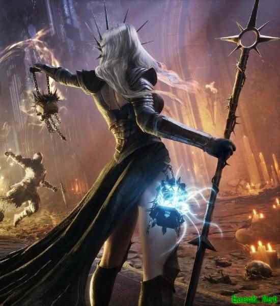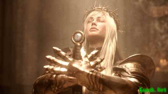 这幅色彩鲜艳的画作描绘了一位神秘的哥特式战士:一头飘逸的白发,头戴尖刺王冠;身着黑色盔甲,露出肩膀和臀部;手持一根镶嵌着闪耀水晶的法杖;身上挂满骷髅锁链。背景是一座阴森的教堂,烛光摇曳,阴影笼罩,一场与身披盔甲的骑士的战斗正在其中展开。这幅画作完美契合了该系列的美学风格,将类魂游戏玩法与黑暗奇幻元素巧妙融合。