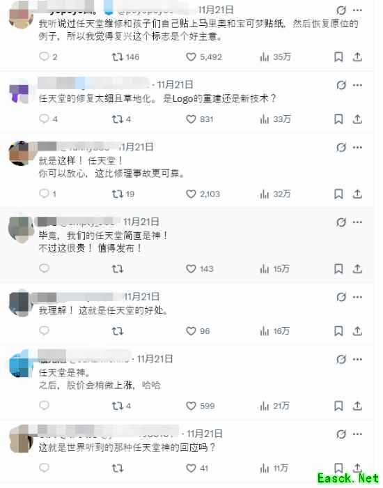 虽然不清楚是换了备用外壳还是用技术手段复原了Logo,但评论区很多网友都对任天堂的服务态度表示赞赏。还有网友提到,任天堂在修理时设备时甚至还会复位小孩子的贴在机身的贴纸,属实认真负责很走心。