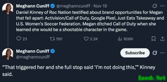 11月19日,在一项诽谤案庭审中,证据提及Megan多项未达成的合作机会,其中包括这次与《使命召唤》的联动。