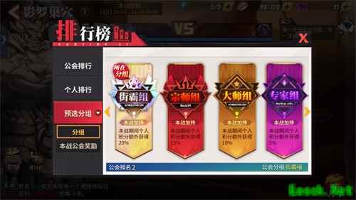 当预选阶段结束后,会按照预选阶段公会积分进行排行,并依据排行结果将公会分配到匹配其实力的组别中。依据排行结果分为街霸组、宗师组、大师组、专家组、格斗组、新秀组。前四个组别在本战阶段会得到更高的个人积分加持。