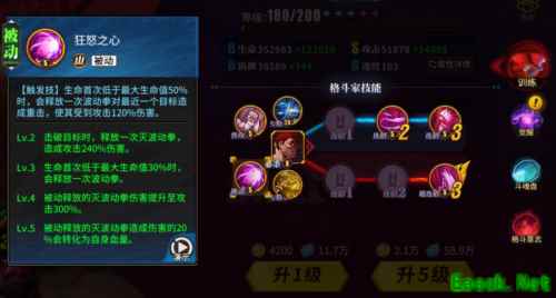 技能方面,狂隆的被动技能“狂怒之心”是非常重要的一项技能!狂隆作为一名“咳血兽”格斗家在发动技能之后会损失自身的HP,所以当“狂怒之心”达到五级之后,每次释放的波动拳造成伤害的百分之20都会转换为自己的HP,让其真正的成为“永动机”