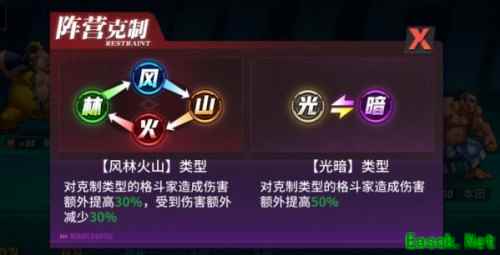 格斗家狂隆的阵营属性定位是山属性,新手在入门之初首先要了解的就是这款游戏的阵营克制系统,简单来说游戏中的所有格斗家被分成了“风,林,火,山,光,暗”六种阵营属性。风克制山,山克制火,火克制林,林克制风,而光与暗是互相克制。如果在游戏中遇见克制的阵营属性队伍,将会对格斗家伤害额外提高百分之30,受到伤害则会减少百分之30。所以当选择了狂隆作为山属性阵营的队伍搭配之后,要时刻记得遇到火属性阵营会压制敌人,遇到风属性阵营则会被反制。
