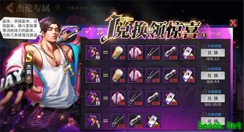 活动期间通关各种副本都可以掉落活动专属道具,收集齐相应的专属道具可以兑换杰霸碎片,共有5、20、25和40四种档次的奖励,每一档的兑换次数不同,