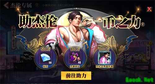 格斗家点击【前往助力】,即可参与活动为杰伦助力。待助力人数增多,到达500万、800万、1000万三个阶段,就可获得钻石、杰霸碎片以及杰伦主界面形象的奖励。