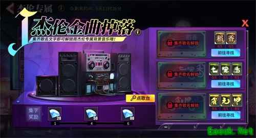 在游戏中寻找杰伦的歌名碎片,可以获得总计150钻石奖励,集齐对应的歌名还能解锁杰伦专属背景音乐,深受大家喜爱的三首金曲《稻香》、《七里香》和《霍元甲》等你解锁。