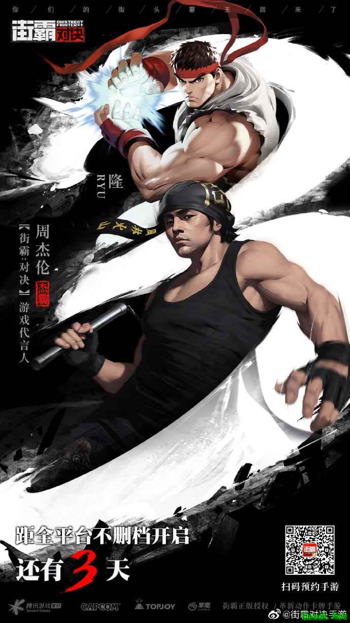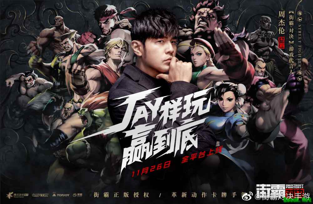 今日(11月23日),《街霸:对决》游戏代言人周杰伦正式官宣!在这街霸的格斗场上周董的绰号是“杰霸”,官方的全平台不删档倒计时海报中,就出现了周董黑色背心手持双截棍的艺术画。以周杰伦为原型设计的全新格斗家“杰霸”,也将同步上线游戏内。