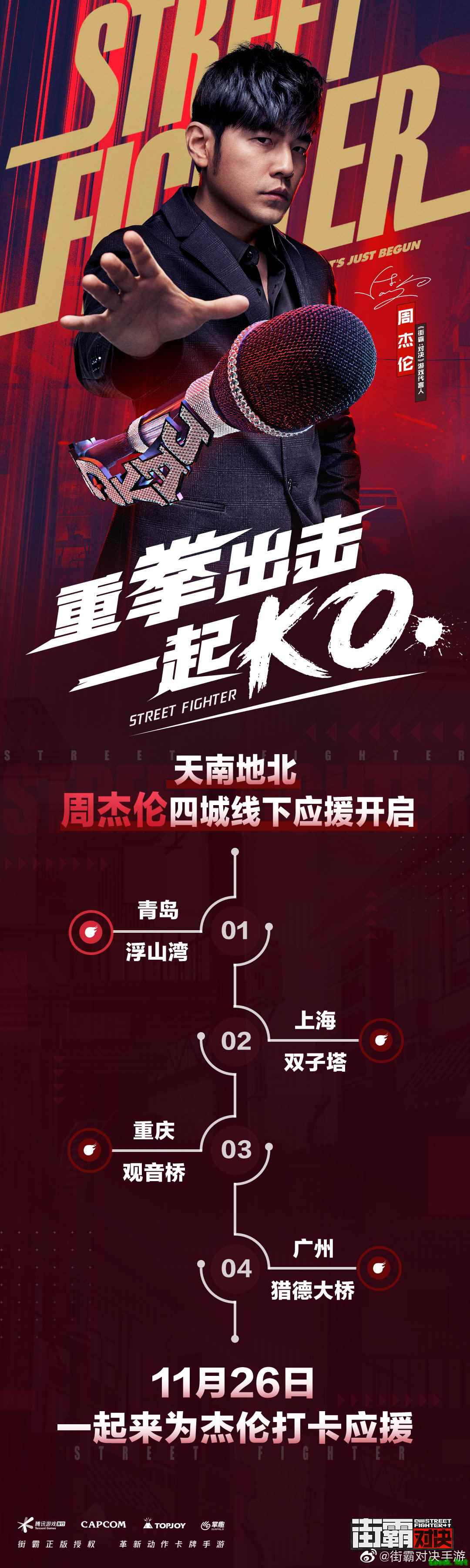 为庆贺《街霸:对决》代言人周杰伦化身杰霸入驻游戏,11月26日晚将开启四城联动应援活动,集结东西南北的杰迷来为杰伦打卡应援。届时青岛的浮山湾、上海的双子塔、重庆的观音桥以及广州的猎德大桥将同步开启线下应援活动。