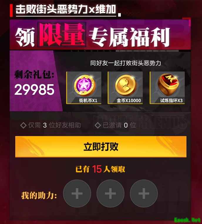 在此呼吁各位格斗家召集好友,共同消灭在街头叫嚣的维加。团结起来吧,邀请3位好友助力共同消耗维加血条,即可获得领取限量专属福利的资格。
