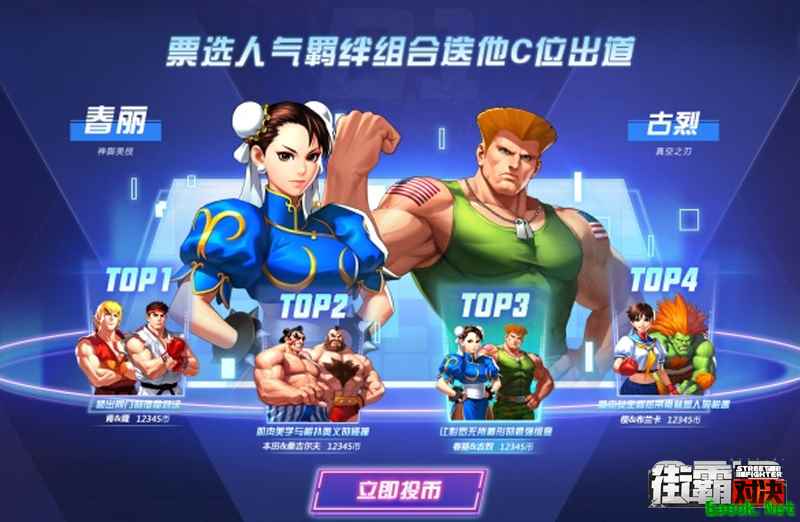 在格斗家共创培养计划中,玩家可以为自己喜欢的羁绊组合“立即投币”。师出同门的宿命对决,“阿多根”的肯和“耗油根”的隆,是不是你最中意的组合?亦或是春丽&古烈的蓝绿CP组合,让你觉得更应该C位出道?樱&布兰卡、本田&桑吉尔夫,亦或是他们是获得你足够认同感的战斗伙伴?参与票选人气CP活动,不仅可以送他们C位出道,还可以领取包括限定头像框在内的丰富奖励。