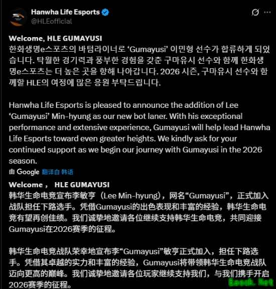 而就在今晚,HLE俱乐部发文官宣,Gumayusi正式加入《英雄联盟》战队担任下路选手!“凭借其卓越的实力和丰富的经验,Gumayusi将带领HLE战队迈向更高的巅峰。”