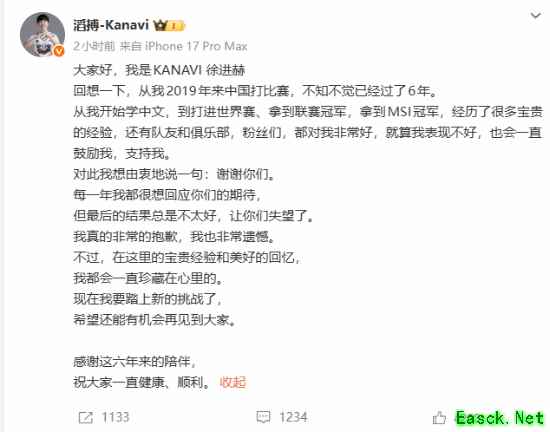 今晚,Kanavi选手在社交媒体发文向队友、俱乐部以及粉丝们致歉并告别: