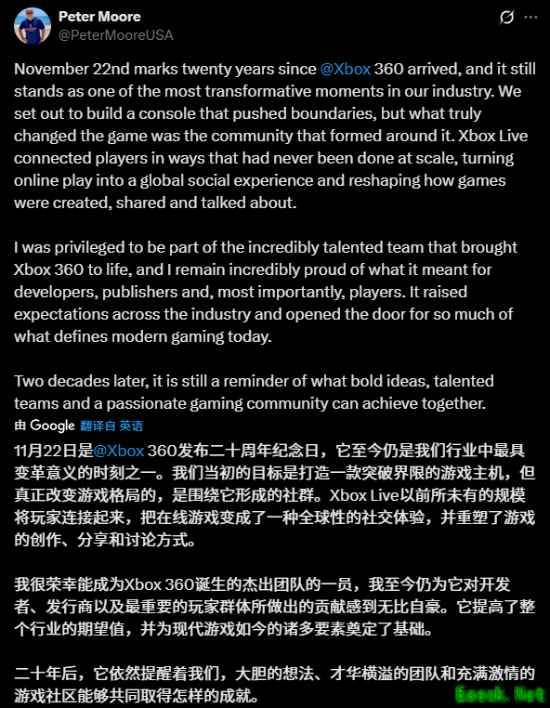 “11月22日是Xbox 360问世二十周年纪念日,它至今仍被视为游戏行业最具变革意义的里程碑之一。我们当初立志打造一台突破界限的游戏主机,但真正改变游戏规则的,是围绕它形成的玩家社群。Xbox Live以前所未有的规模将玩家连接在一起,使在线游戏发展成为全球化的社交体验,并彻底重塑了游戏的创作、分享与讨论方式。”