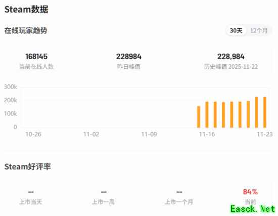 根据Steam数据显示,就在昨晚,《燕云十六声》在Steam平台的玩家在线峰值再创新高,来到228984人!Steam评论目前为35381条,好评率84%,“特别好评”!