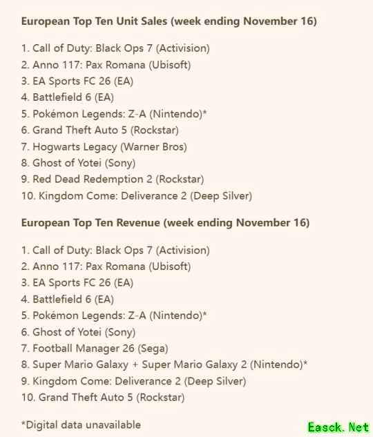 尽管《使命召唤:黑色行动7》成功登顶上周欧洲地区游戏销量榜,但其市场表现较前作及竞争对手出现显著下滑。根据GSD统计数据显示,该作实体版与数字版的首周总销量较《战地6》同期低63%。