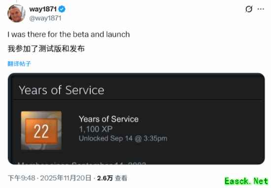 随后有玩家展示了自己的Steam资料页面的22年“老兵”徽章,引来大量网友围观。