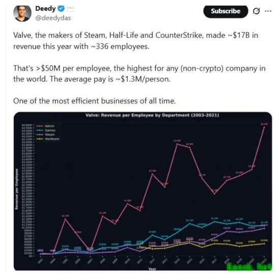 根据社交平台用户Deedydas披露的信息,Valve在2025年实现人均创收5000万美元,这一数字使其超越所有非加密货币企业,位居全球效率榜首。目前Valve拥有约336名员工,预计2025年总收入将达到约170亿美元。在此榜单中排名第二的OnlyFans,其人均创收约为3000万美元,与Valve存在明显差距。