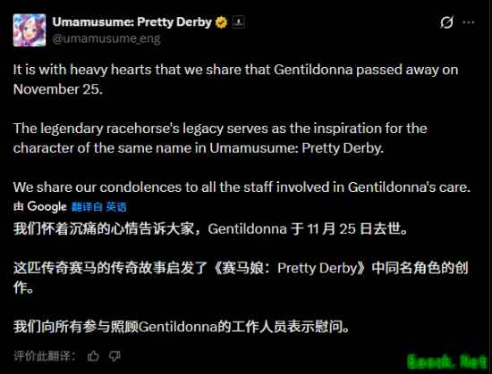 据日媒denfaminicogamer报道,日本传奇赛马Gentildonna(贵妇人)已于近日去世,享年16岁。这匹赛马是游戏《赛马娘Pretty Derby》中同名角色的原型,游戏官方已通过社交媒体表示哀悼。