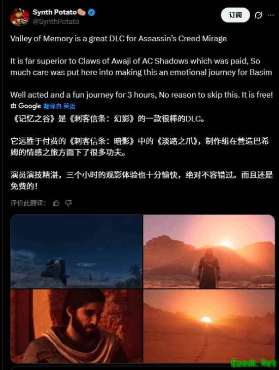 国外博主Synth Potato发文表示“记忆之谷”的表现远超预期,直言明显比《刺客信条:影》此前的付费DLC淡路之爪还要强:“制作团队投入了大量心血,让巴西姆的旅程充满情感。”